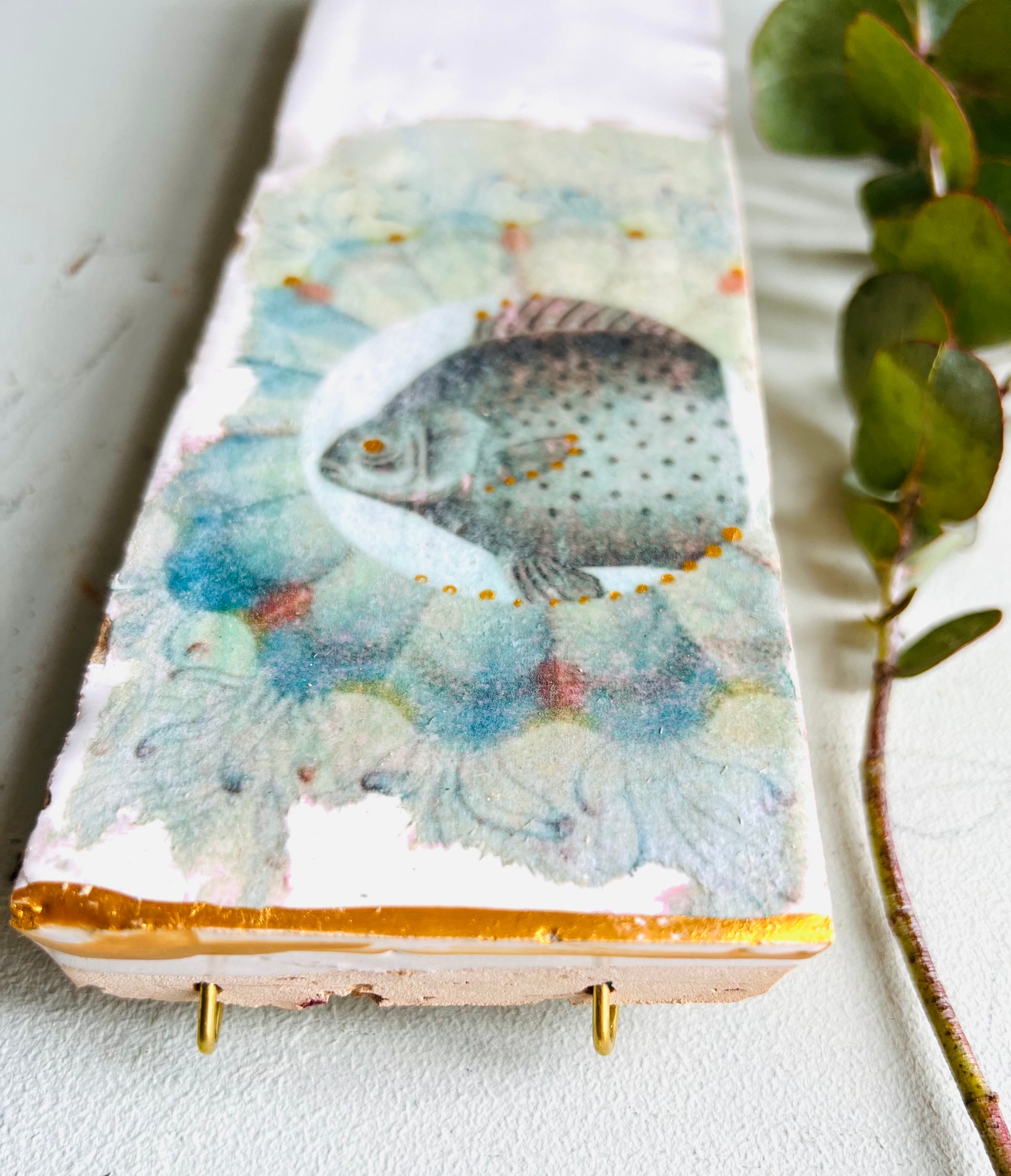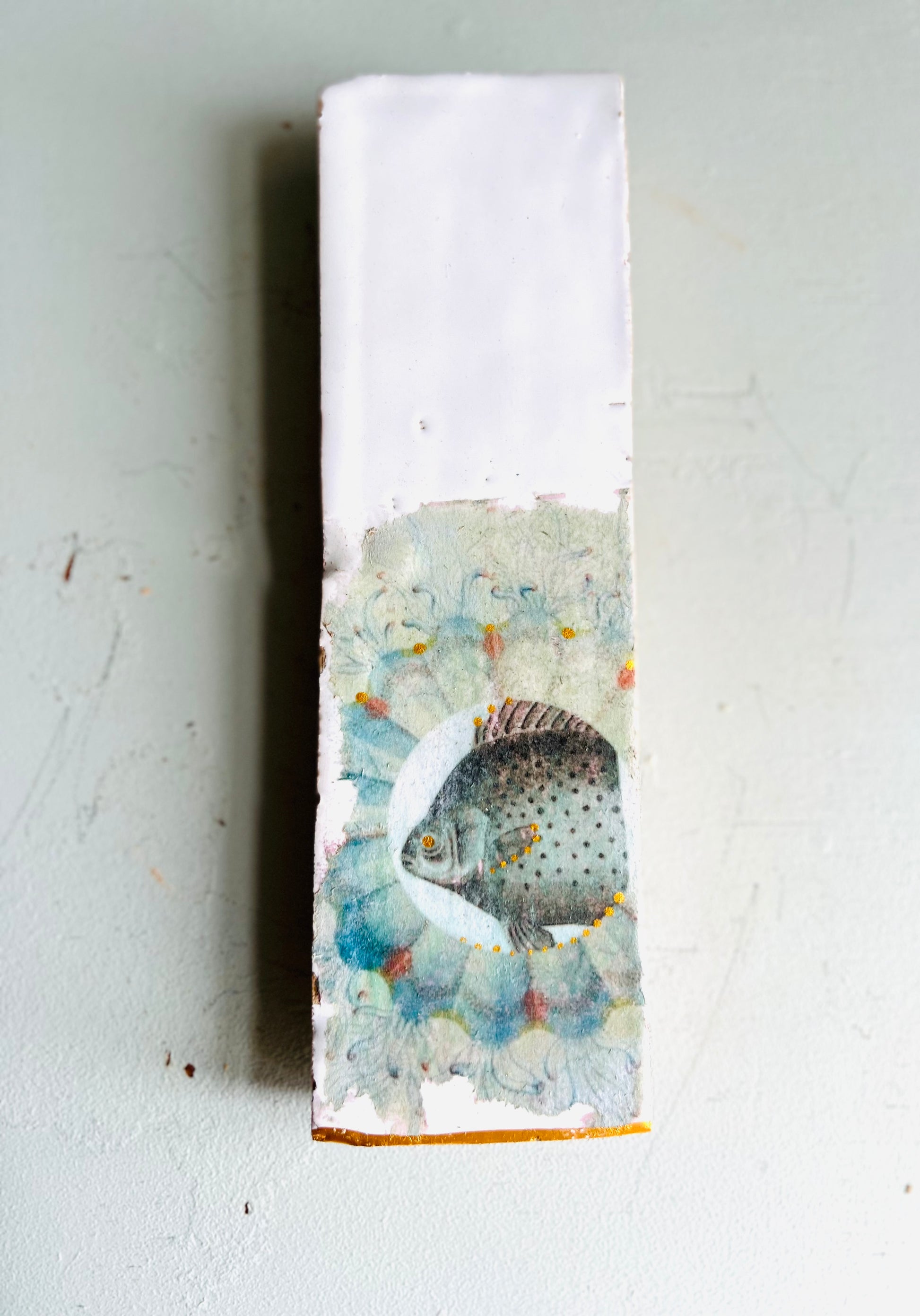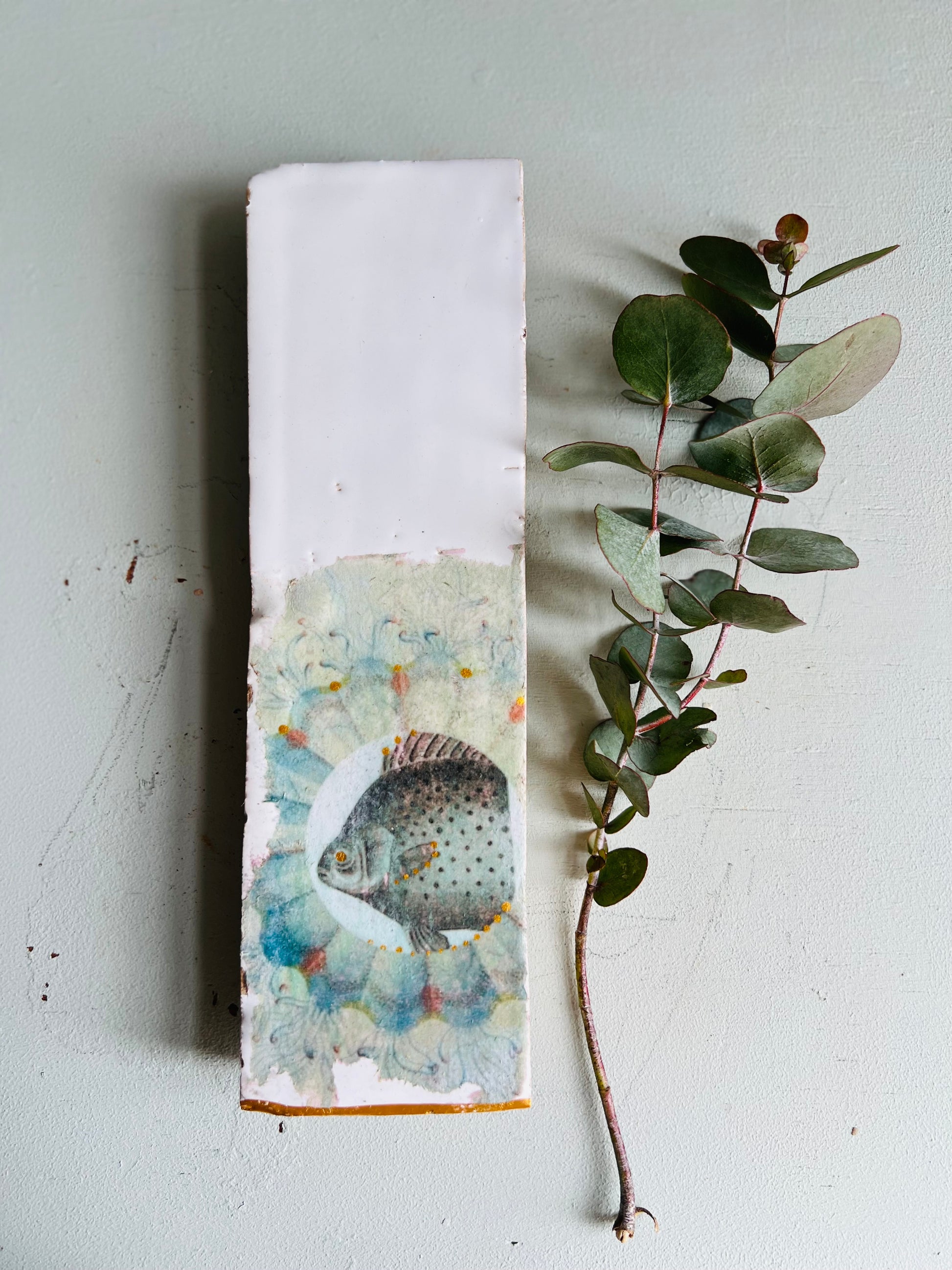 Handgefertigte, zellige Tonfliese mit Collage aus alten Lithografien. Zarte Goldeffekte und eine Goldkante, die jedes unserer Stücke ziert, runden das Gesamtbild ab.