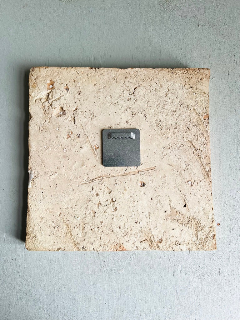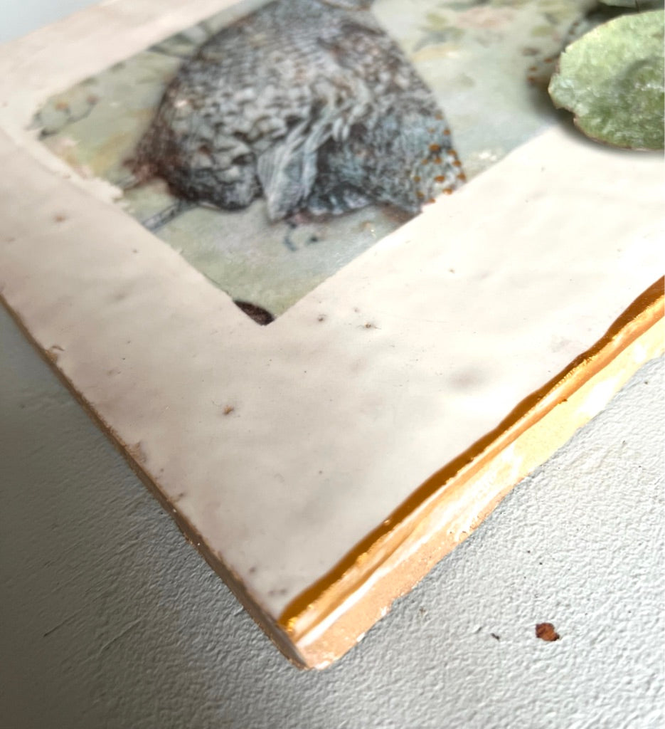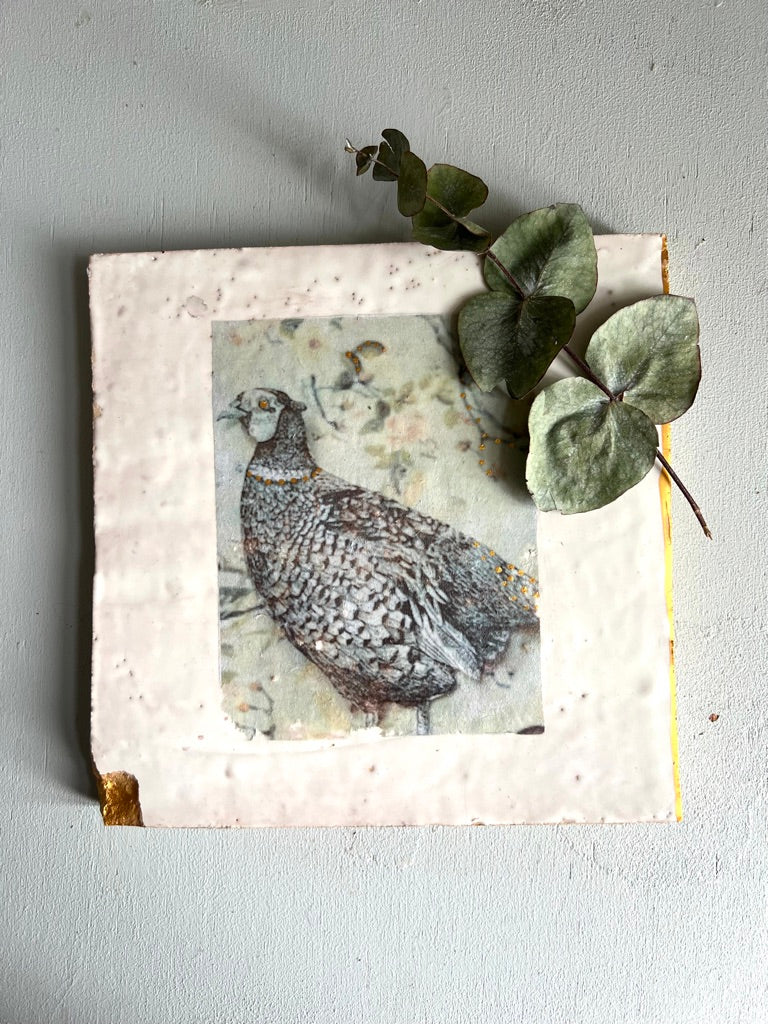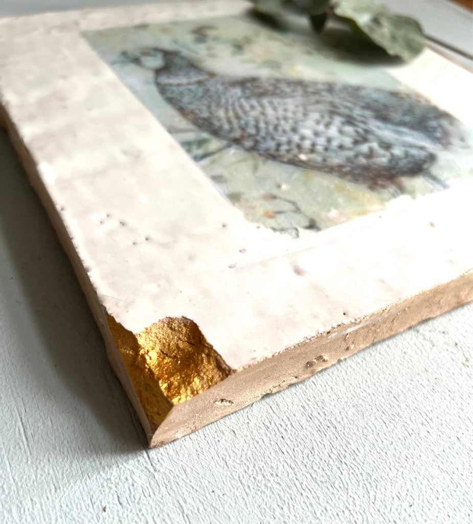 Handgefertigte, zellige Tonfliese mit Collage aus alten Lithografien. Zarte Goldeffekte und eine Goldkante, die jedes unserer Stücke ziert, runden das Gesamtbild ab.