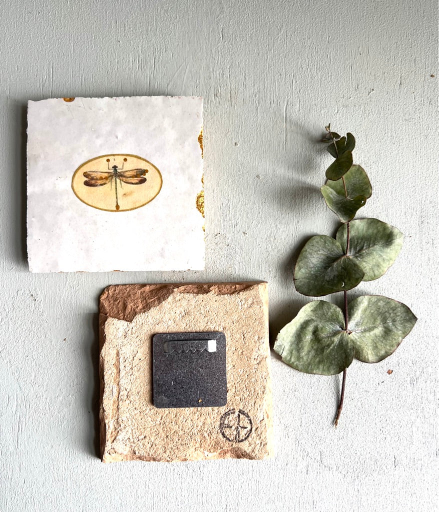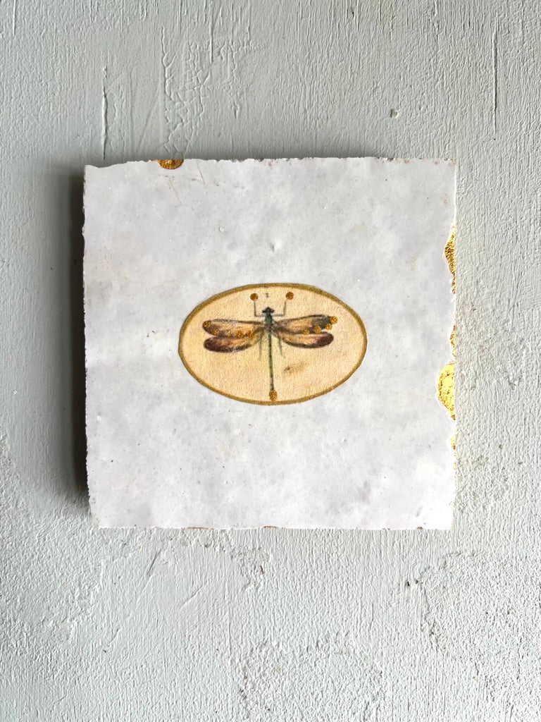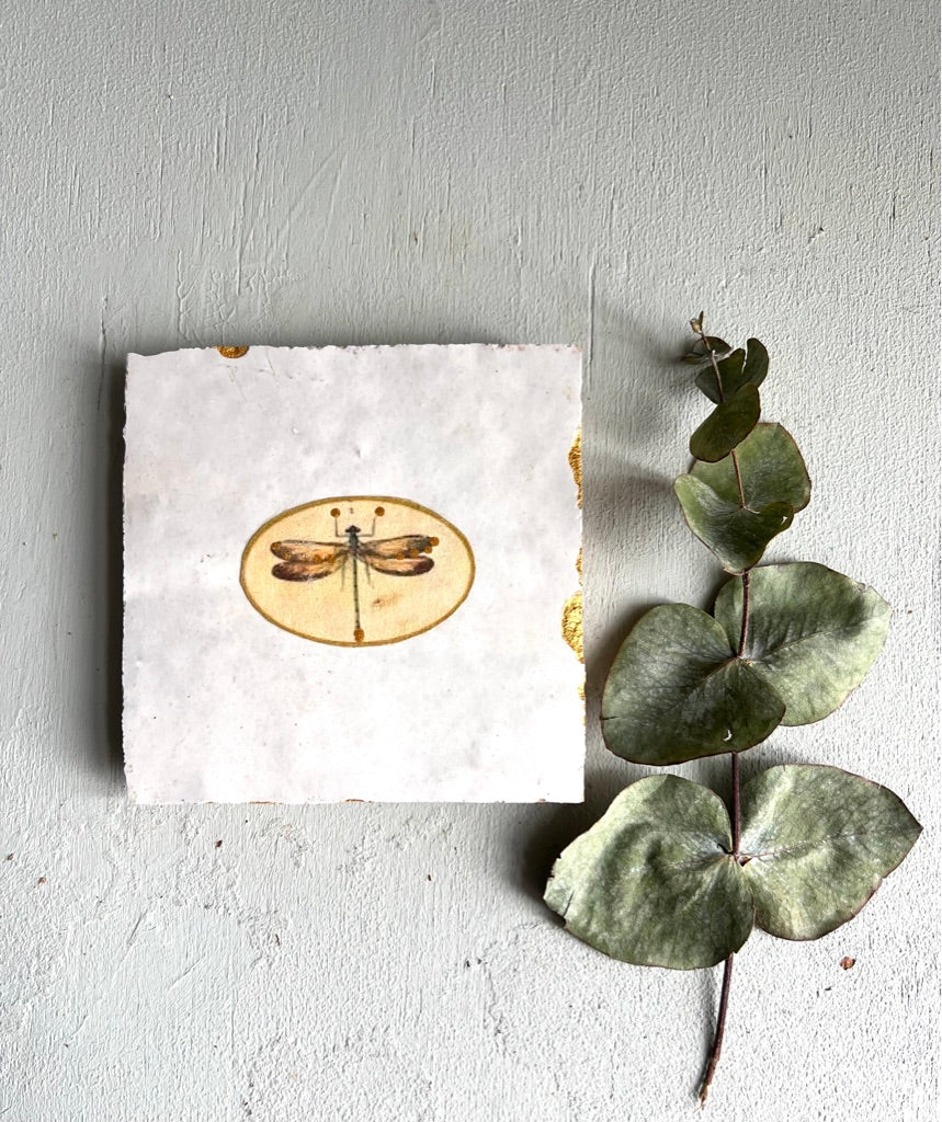 Handgefertigte, zellige Tonfliese mit Collage aus alten Lithografien. Zarte Goldeffekte und eine Goldkante, die jedes unserer Stücke ziert, runden das Gesamtbild ab.