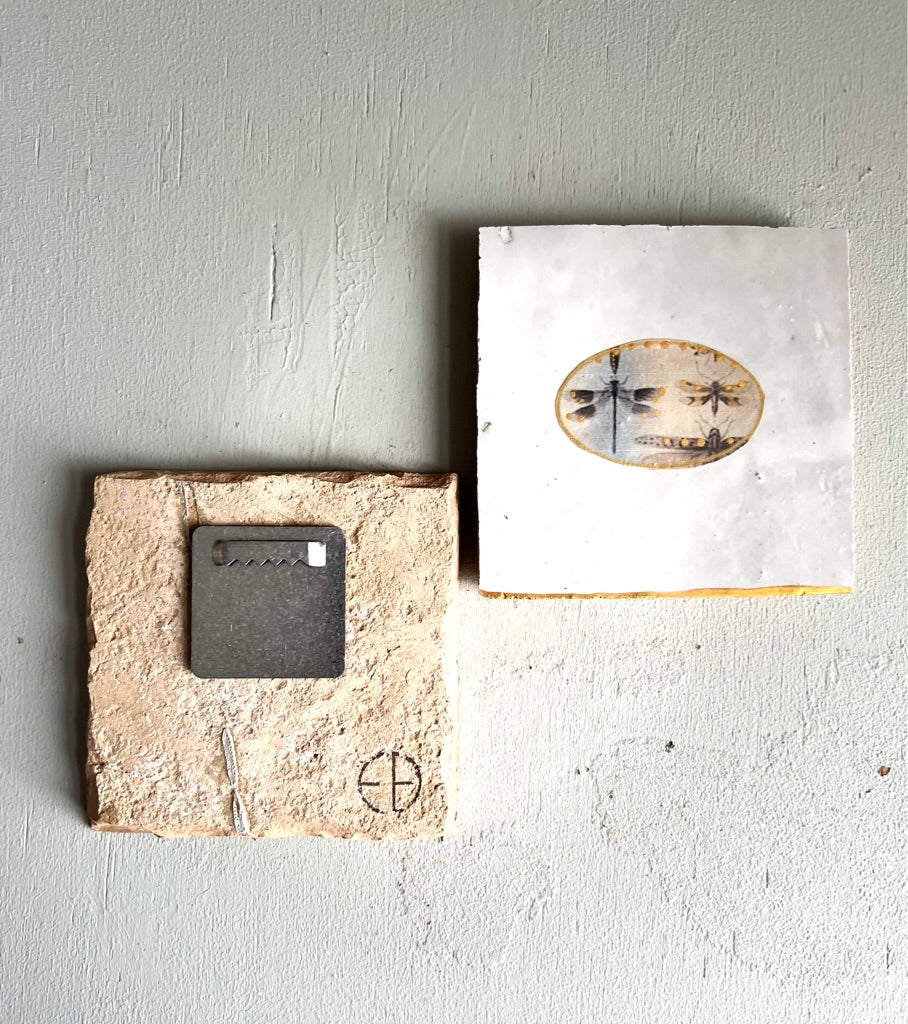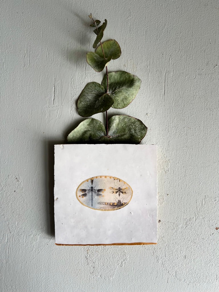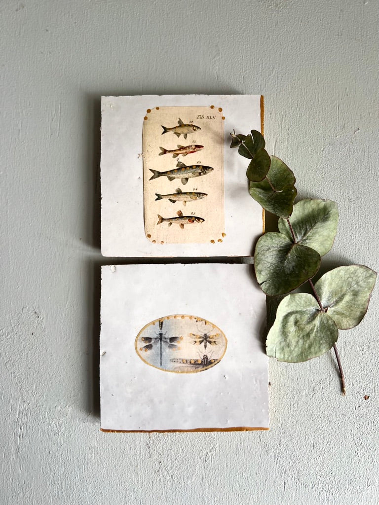 Handgefertigte, zellige Tonfliese mit Collage aus alten Lithografien. Zarte Goldeffekte und eine Goldkante, die jedes unserer Stücke ziert, runden das Gesamtbild ab.